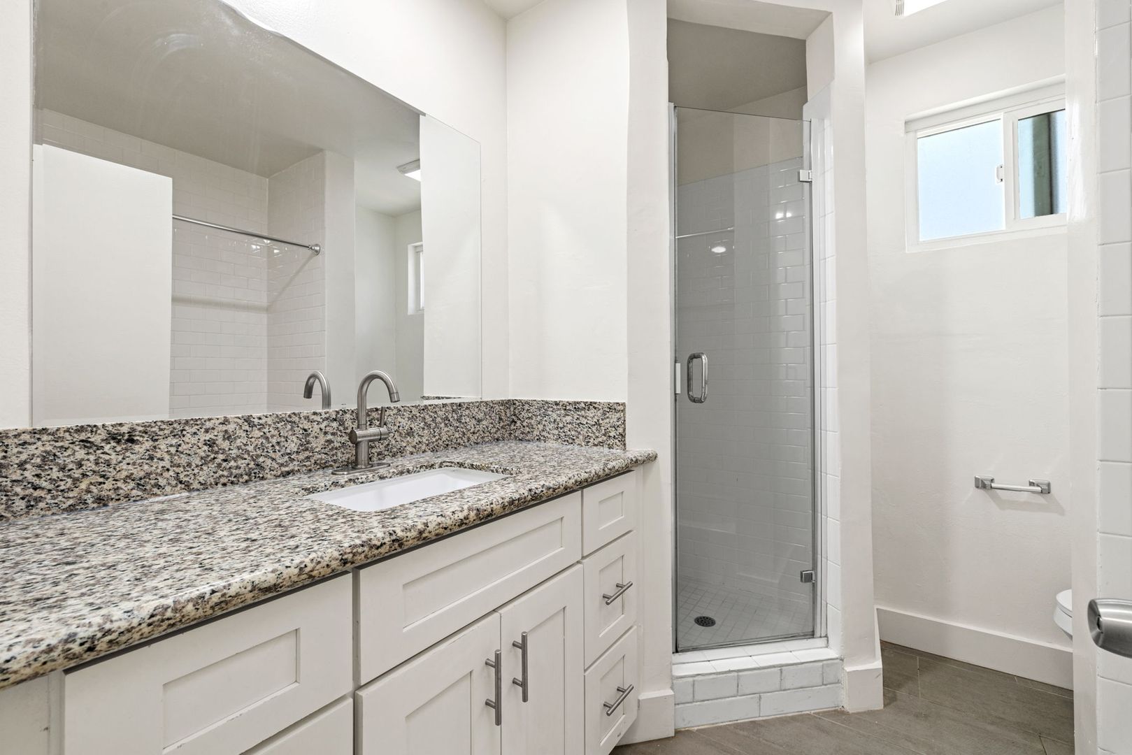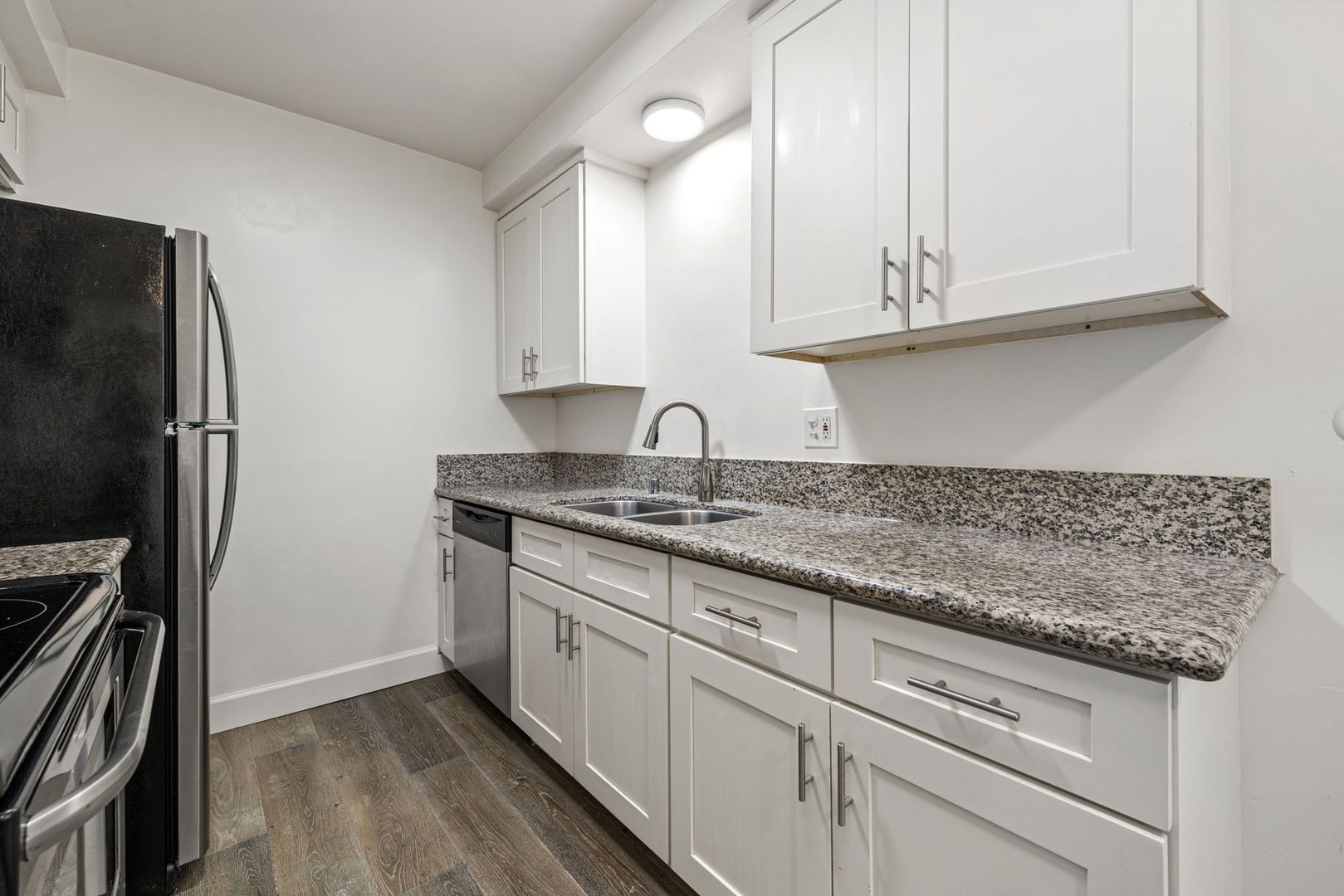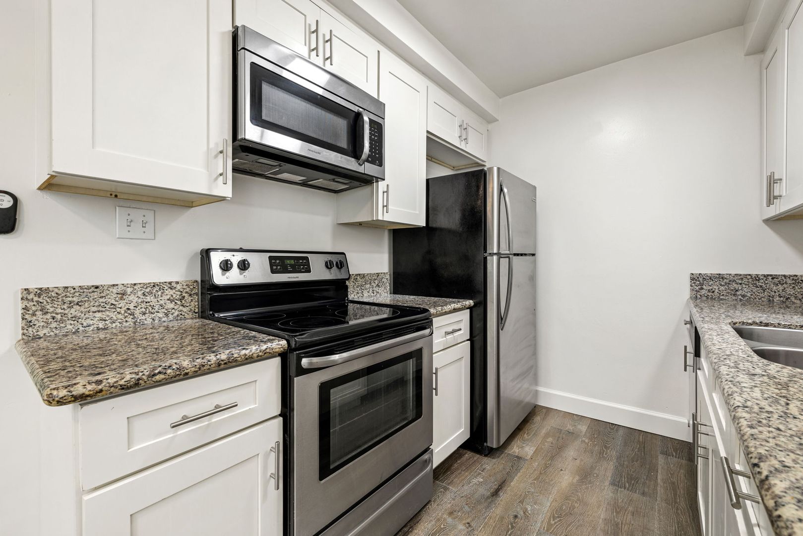Remodeled 2 Bedroom 2 Bathroom with: Shaker white cabinets in the kitchen and bathroom, granite, tile floors in the kitchen and bathroom, stylish wood laminate floors in the living room, carpet in bedroom, STAINLESS STEEL APPLIANCES, crown molding in living room, and A SMOOTH LIVING ROOM AND KITCHEN CEILING! Controlled Access building. This unit also includes a 1 gated carport parking spot. 1 Year Minimum Lease.