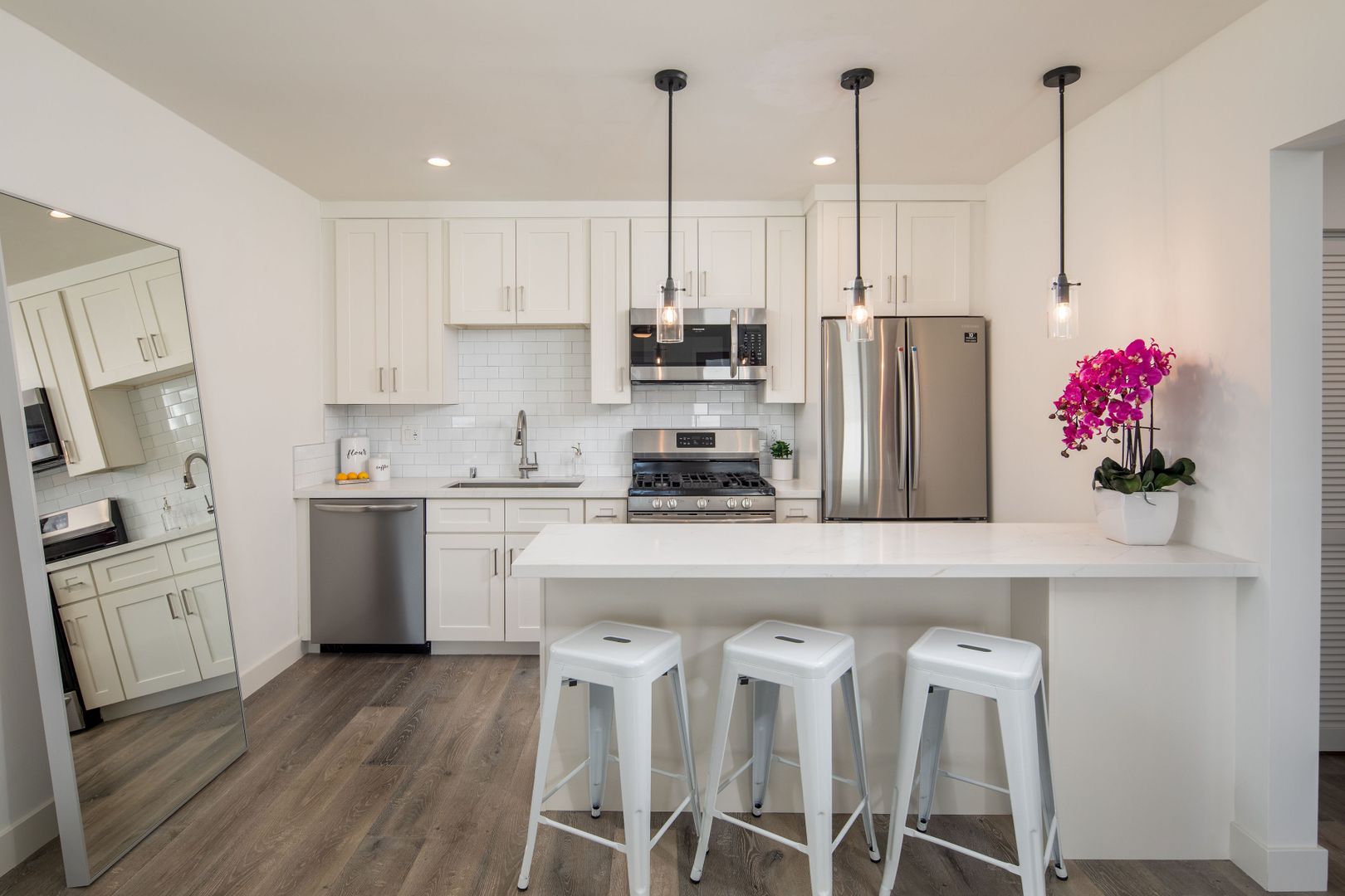 NEWLY Remodeled 1 Bedroom 1 Bathroom apartment comes with: Shaker white cabinets in the kitchen and bathrooms, white quartz counters, tile floors in the bathroom, stylish wood laminate floors in the living room, kitchen & bedrooms, new SOAKING (DEEP) tub and wall tile, Recessed lighting, STAINLESS STEEL APPLIANCES (dishwasher, range, microwave & refrigerator), WASHER and DRYER in unit, fixtures and SMOOTH CEILINGS throughout!