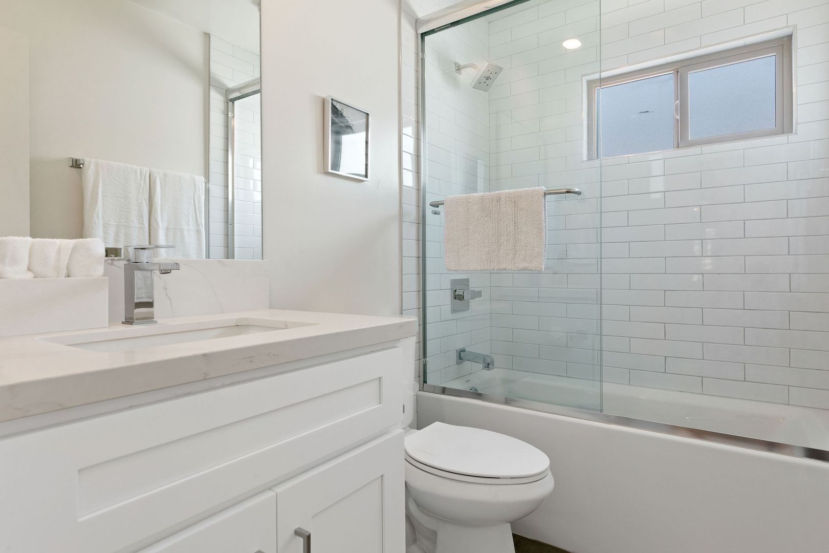 BRAND NEW — Remodeled 2-bedroom, 2-bathroom apartments with: Shaker white cabinets in the kitchen and bathrooms, white quartz counters, tile floors in the bathroom, stylish wood laminate floors in the living room, kitchen & bedrooms, SOAKING (DEEP) tub, STAINLESS STEEL APPLIANCES (dishwasher, range, microwave & refrigerator), WASHER and DRYER & AC in unit, fixtures and SMOOTH CEILINGS throughout!