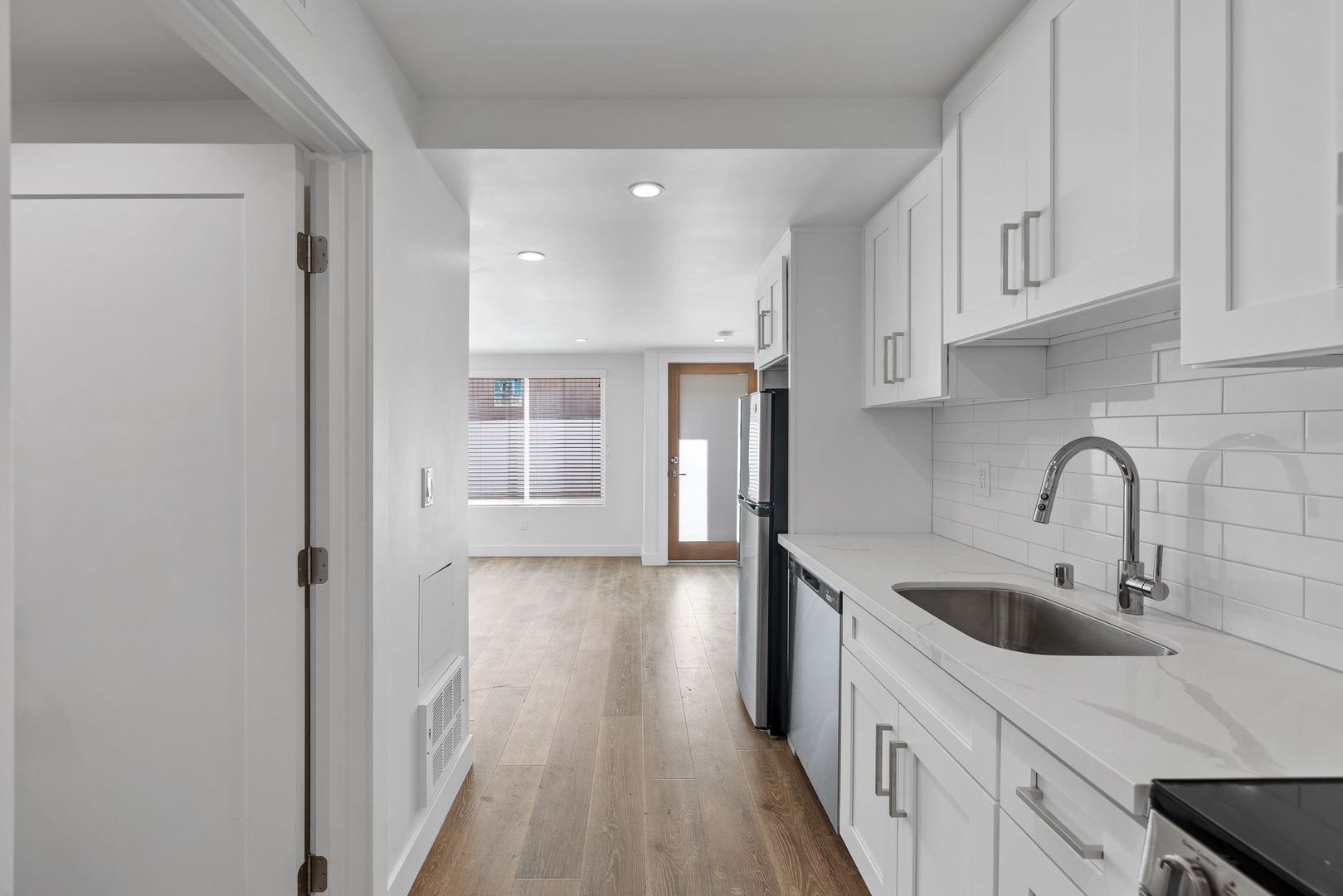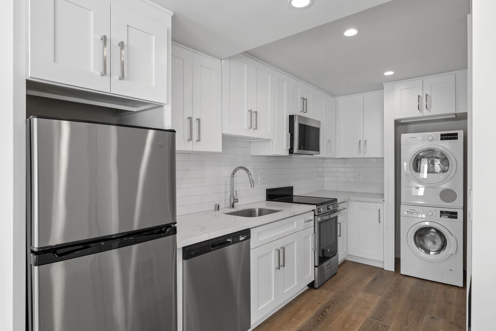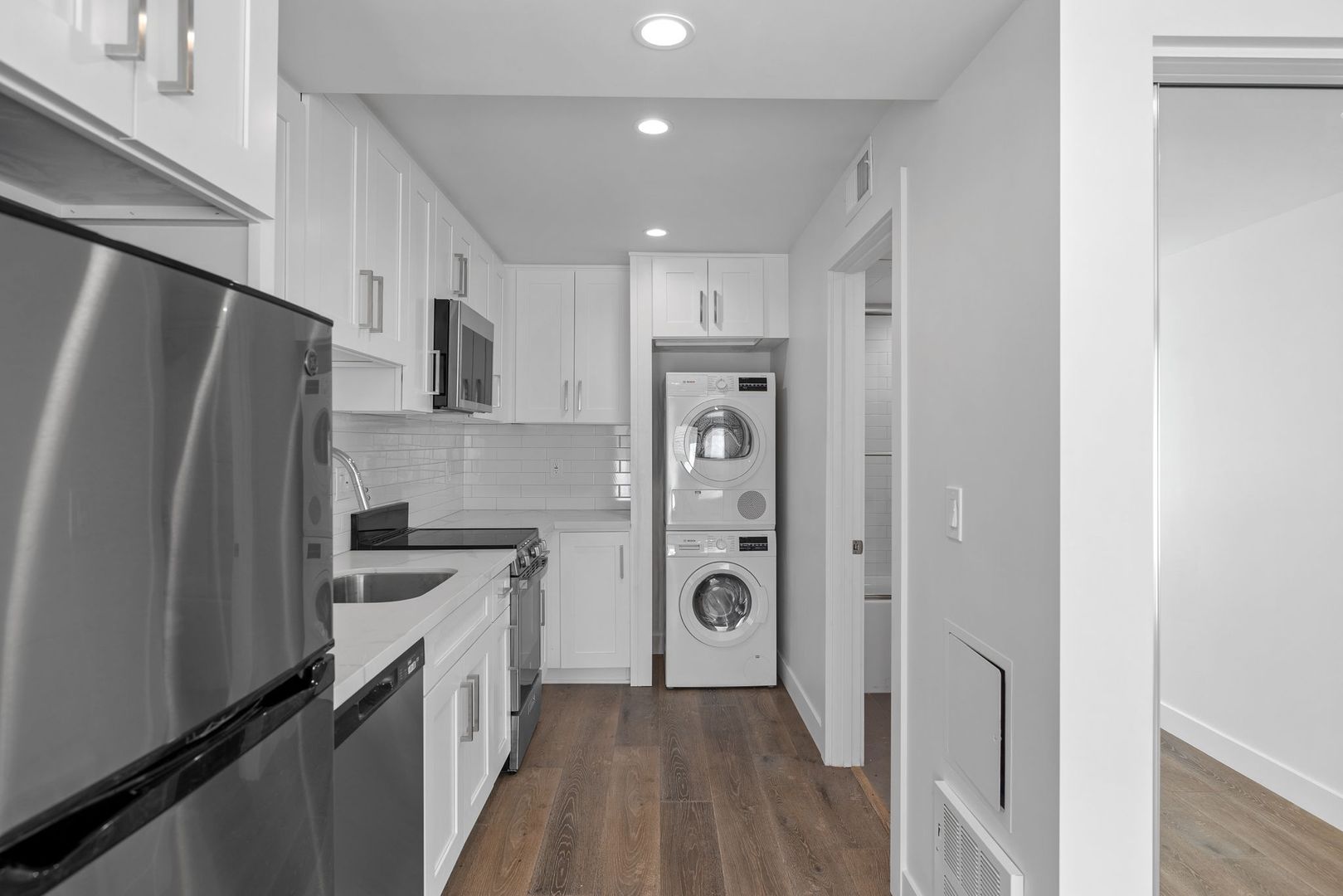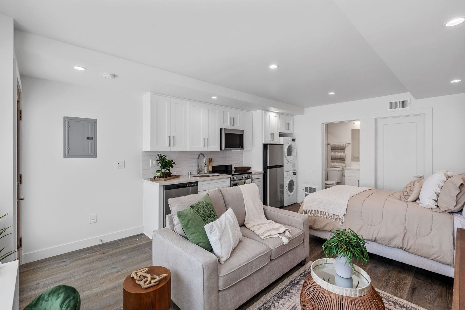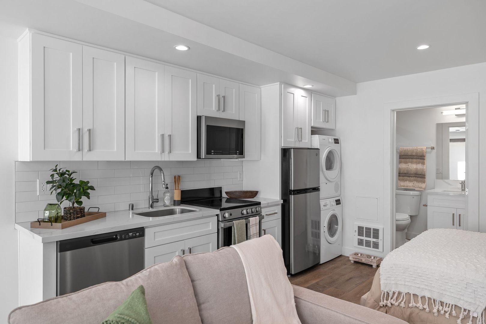 NEWLY Remodeled S — STUDIO, 1-bathroom apartments with: Shaker white cabinets in the kitchen and bathrooms, white quartz counters, tile floors in the bathroom, stylish wood laminate floors throughout, SOAKING (DEEP) tub, STAINLESS STEEL APPLIANCES (dishwasher, range, microwave & refrigerator), WASHER and DRYER, fixtures and SMOOTH CEILINGS throughout!
