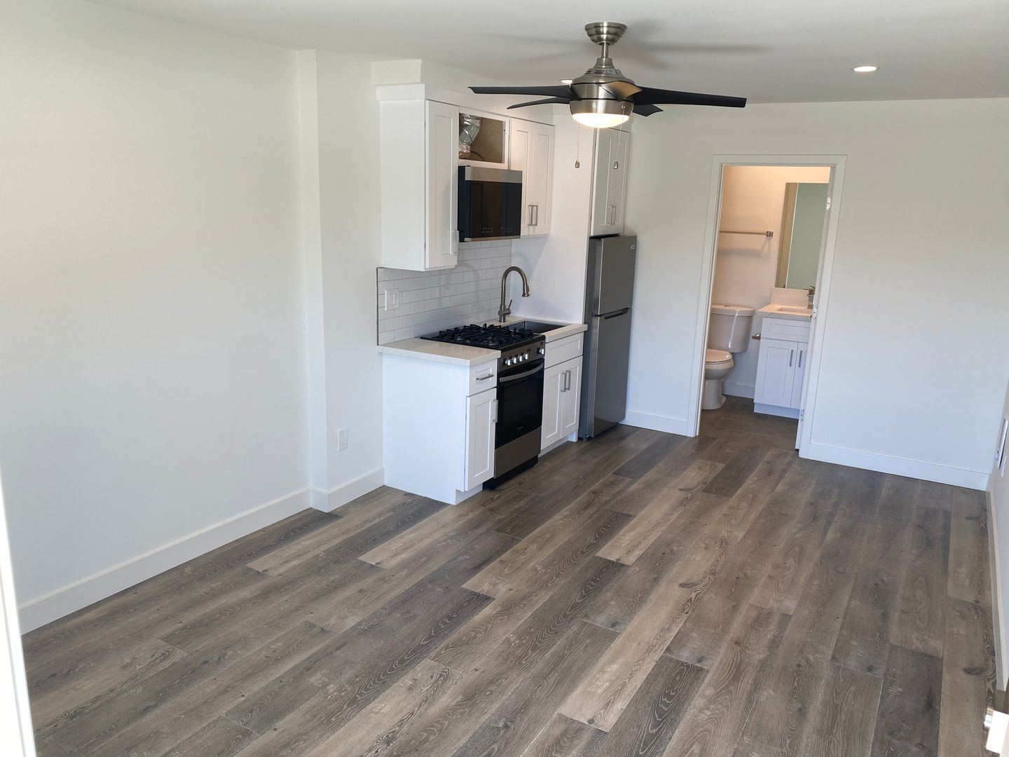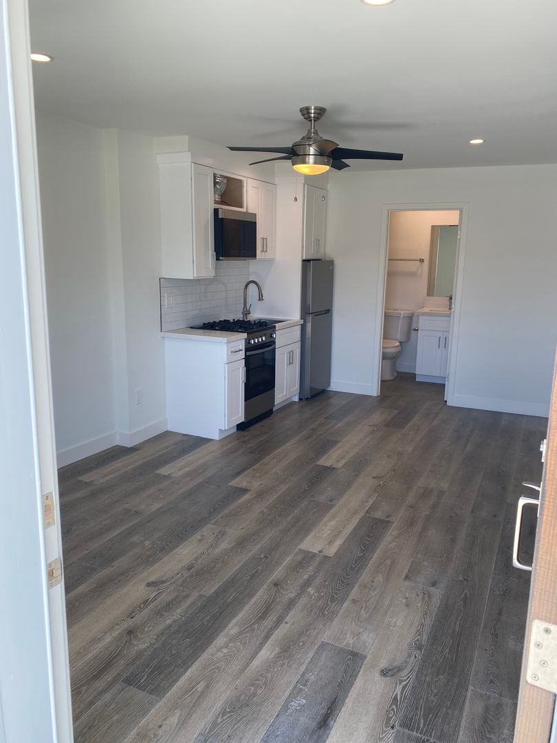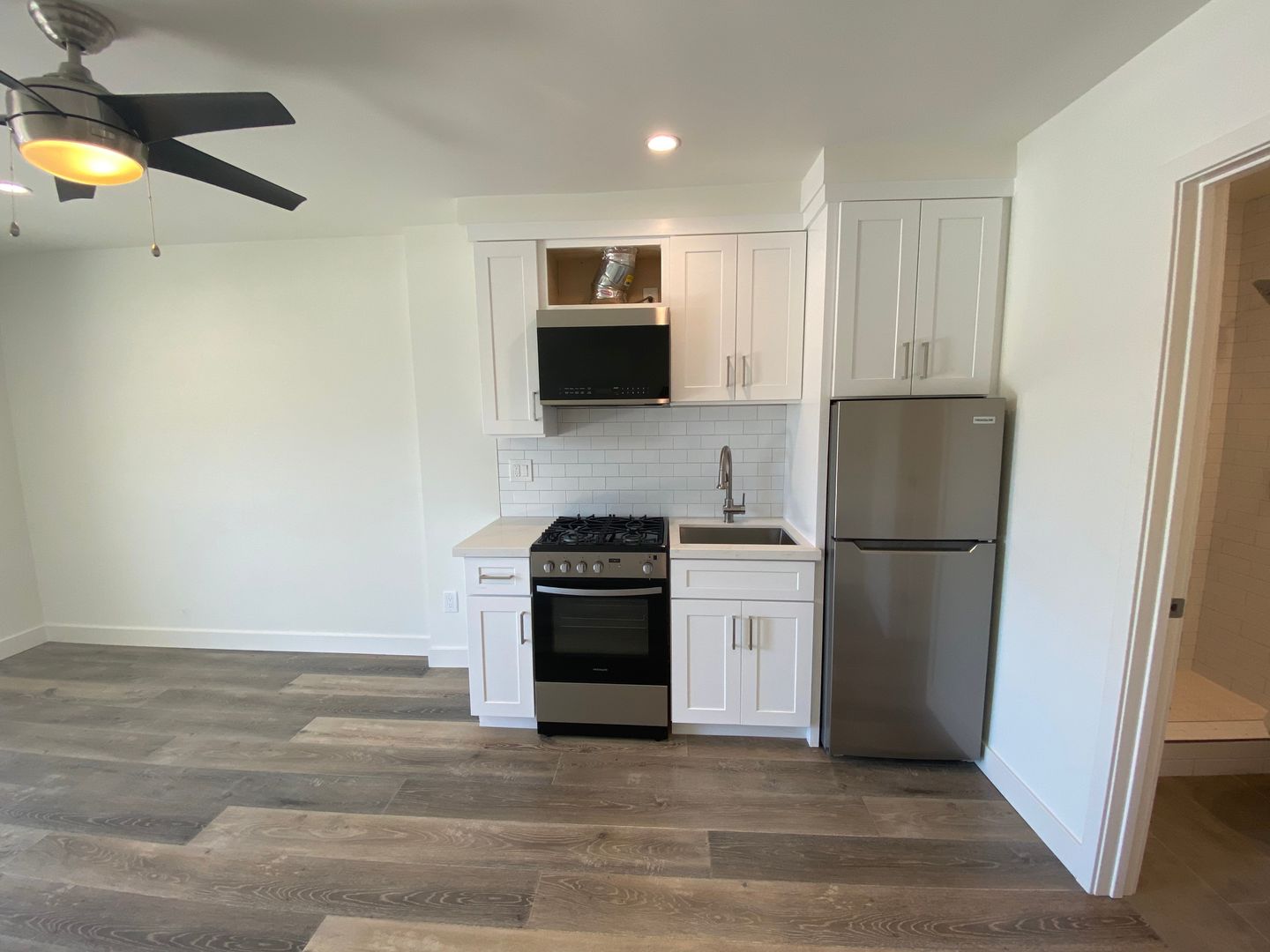 Remodeled STUDIO apartment comes with: Shaker white cabinets in the kitchen and bathrooms, white quartz counters, tile floors in the bathroom, stylish wood laminate floors in the living room, kitchen & bedrooms and wall tile, Recessed lighting, STAINLESS STEEL APPLIANCES (range, microwave & refrigerator), WASHER and DRYER onsite, fixtures and SMOOTH CEILINGS throughout!