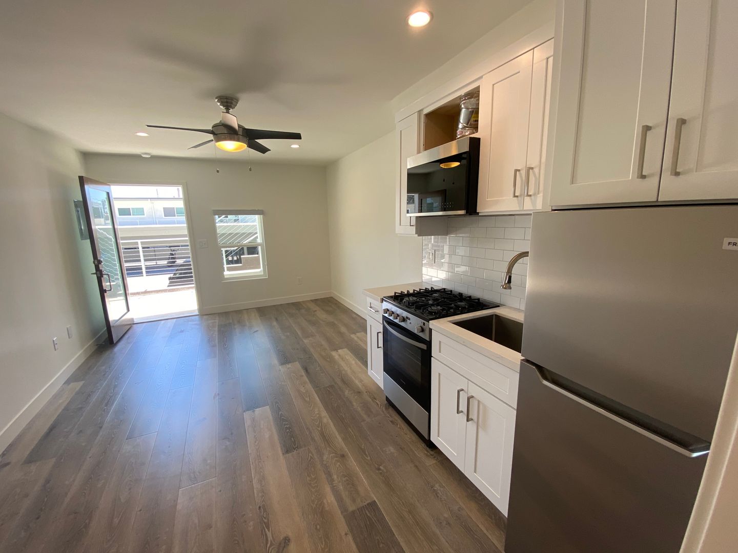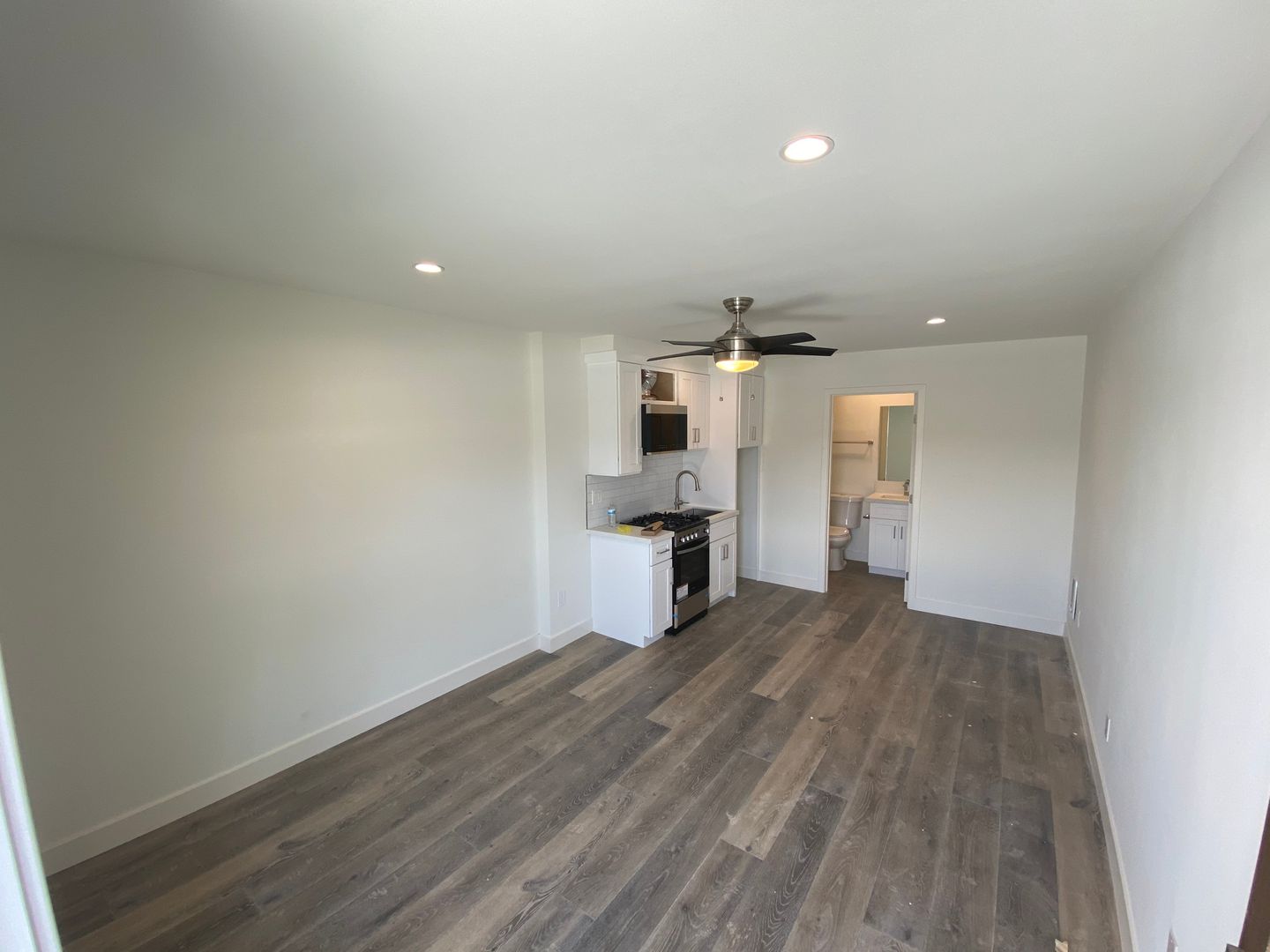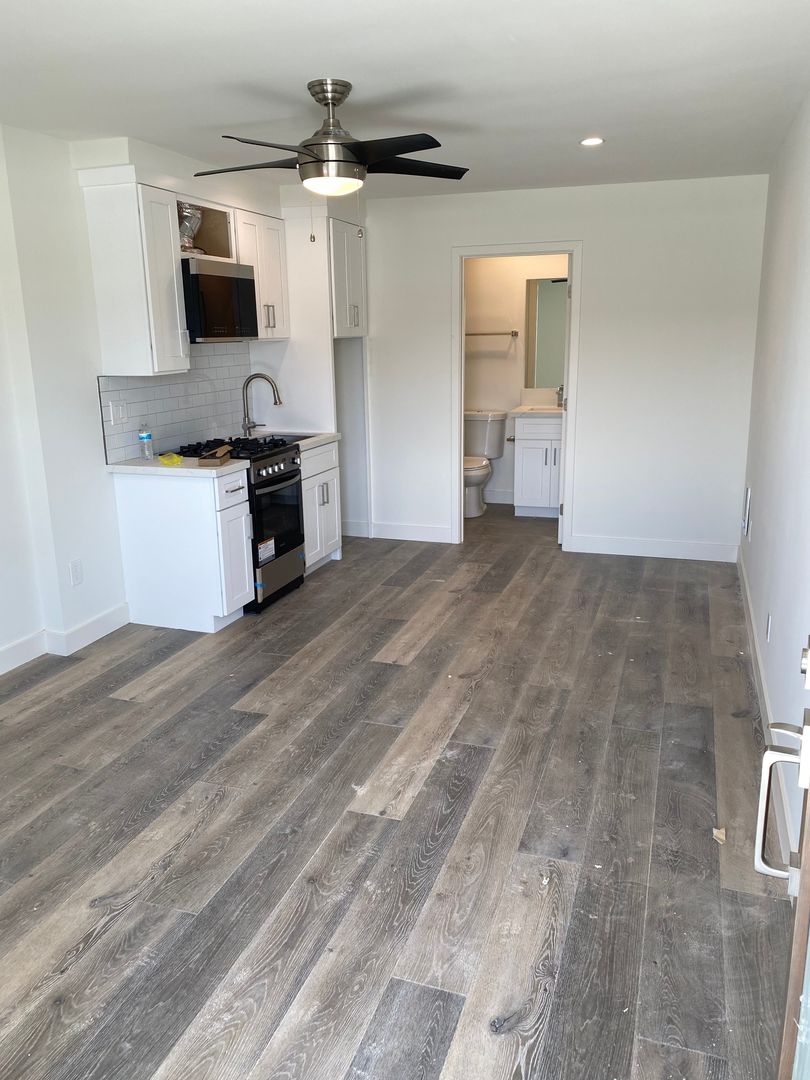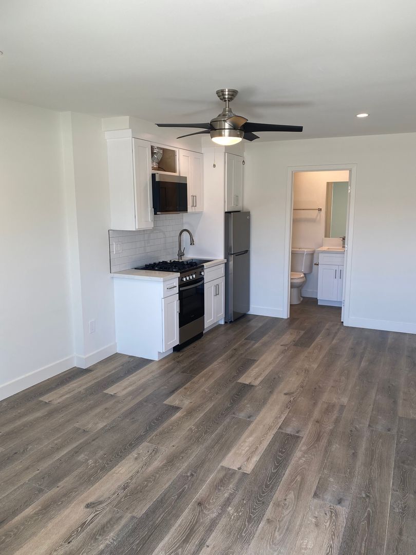 Remodeled STUDIO apartment comes with: Shaker white cabinets in the kitchen and bathrooms, white quartz counters, tile floors in the bathroom, stylish wood laminate floors in the living room, kitchen & bedrooms and wall tile, Recessed lighting, STAINLESS STEEL APPLIANCES (range, microwave & refrigerator), WASHER and DRYER onsite, fixtures and SMOOTH CEILINGS throughout!