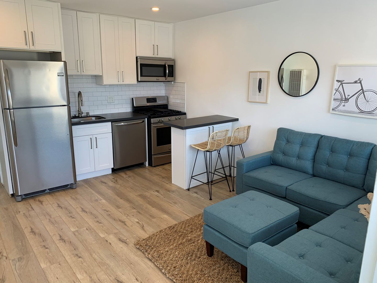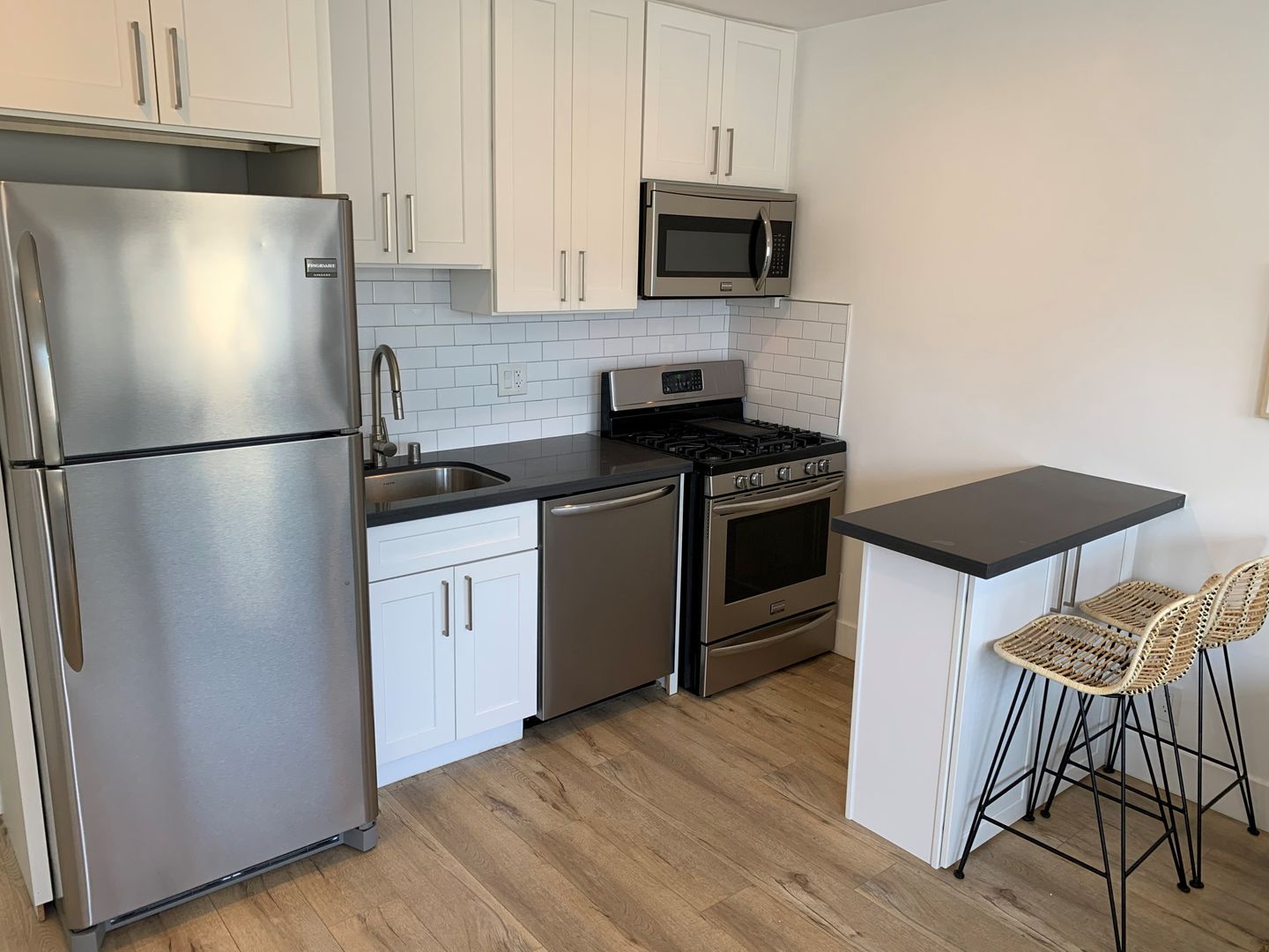 Remodeled 1BD 1BA comes with new: Shaker white cabinets in the kitchen and bathrooms, grey quartz counters, tile floors in the bathroom, stylish wood laminate floors in the living room, kitchen & bedrooms, new tub and wall tile, RECESSED lighting, STAINLESS STEEL APPLIANCES (dishwasher, range, microwave & refrigerator), fixtures and SMOOTH CEILINGS throughout!