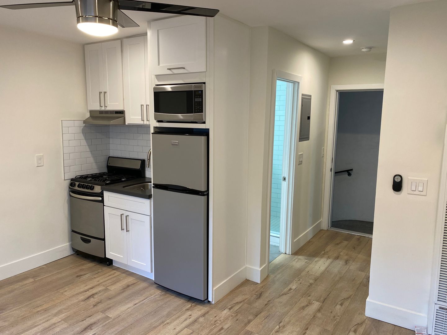Remodeled STUDIO comes with new: Shaker white cabinets in the kitchen and bathrooms, grey quartz counters, tile floors in the bathroom, stylish wood laminate floors in the living room, kitchen & bedrooms, new tub and wall tile, RECESSED lighting, STAINLESS STEEL APPLIANCES (dishwasher, range, microwave & refrigerator), fixtures and SMOOTH CEILINGS throughout!